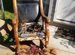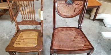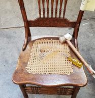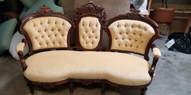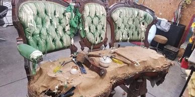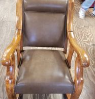 Complete rebuild of broken back and arms. Restored the wood finish replacing wood veneer inlays to original.